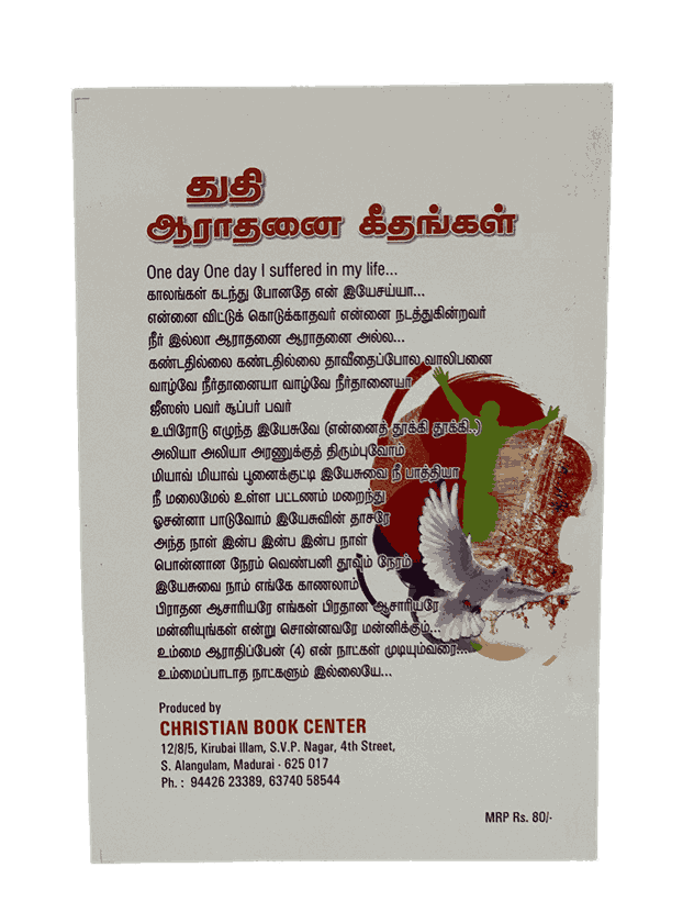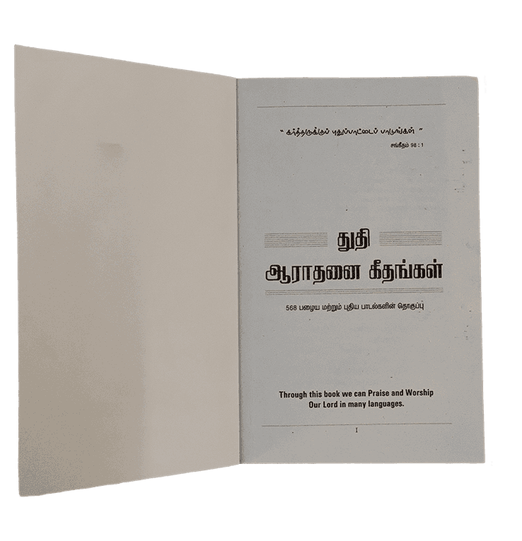 The Thuthi Aarathanai Geethangal book is a comprehensive compilation of Tamil worship songs that have been sung in churches and personal worship settings for generations. It includes both classic hymns and contemporary songs that focus on glorifying God and expressing devotion. The songs are thoughtfully selected to cover a wide range of themes such as praise, worship, and adoration, making it a valuable resource for worship leaders, choirs, and individuals alike. This book fosters an atmosphere of reverence and awe, allowing worshipers to draw closer to God through meaningful, heartfelt music.